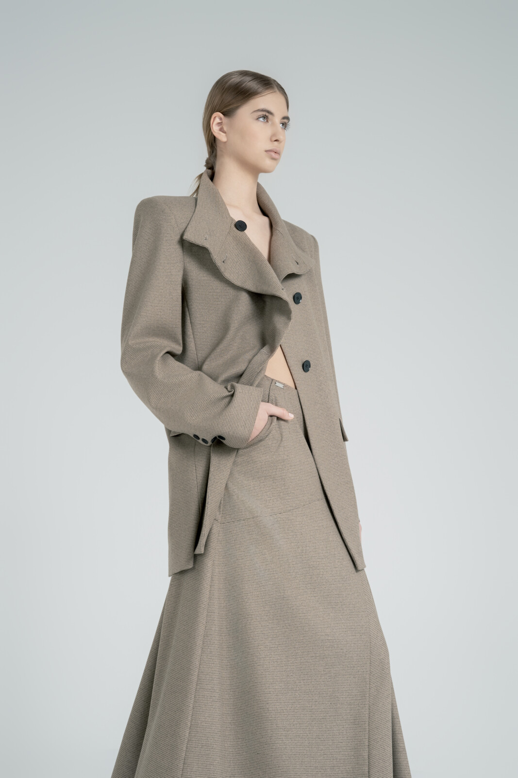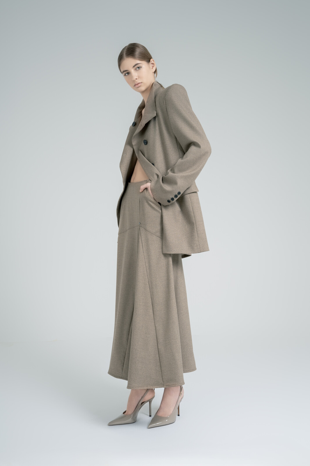 Fusta completează silueta cu o cădere fluidă și echilibrată. Ușor de integrat în diferite outfit-uri casual sau cocktail cu bluze fine din lână sau mătase, sacouri structurate sau fluide.